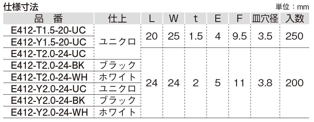 | 000-009-342 | 131 | E412-T2.0-24-UC | アングル天板止め (立穴) | 鋼 ユニクロ |