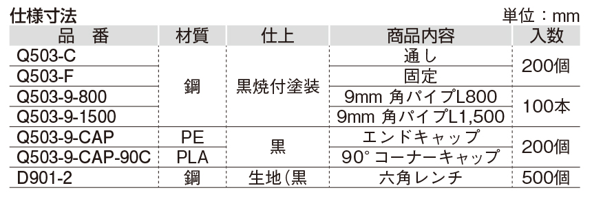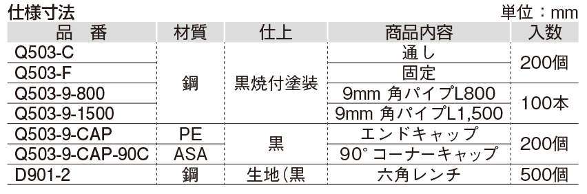 | 000-007-029 | 373 | Q503-9-1500 | 9mm角パイプL1500 | 鋼 黒焼付塗装 |